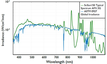 配以空氣濾片,SciSun太陽(yáng)模擬器的光譜輸出非常接近太陽(yáng)光譜,如圖所示