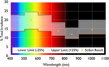 配以空氣濾片,SciSun太陽(yáng)模擬器的光譜輸出非常接近太陽(yáng)光譜,如圖所示