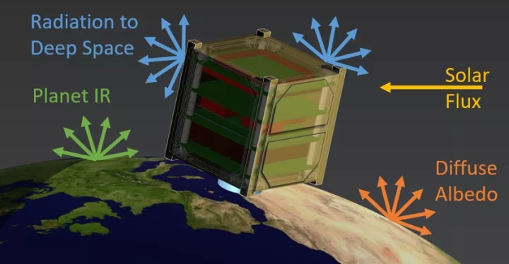 其次,對(duì)于近地軌道上的衛(wèi)星,入射到地球日光側(cè)的太陽(yáng)光通量會(huì)被漫反射到衛(wèi)星朝向地球一側(cè)的表面。這些反射的大小取決于地球的局部表面特性以及不斷變化的大氣條件??偟膩?lái)說(shuō),漫反射太陽(yáng)光通量大約是直接太陽(yáng)光通量的三分之一,被稱為反照率通量。當(dāng)衛(wèi)星進(jìn)入日食時(shí),這些直接的太陽(yáng)光通量和反照率載荷下降為零,但有一個(gè)第三環(huán)境熱源始終存在。地球是溫暖的,相當(dāng)于一個(gè)漫射器,其紅外輻射的大小是緯度和經(jīng)度的函數(shù)。知道這些隨時(shí)間變化的環(huán)境通量,以及它們?cè)谛l(wèi)星表面的分布,是計(jì)算衛(wèi)星溫度所需要的輸入,這涉及到求解固體部分的熱傳導(dǎo)和所有暴露表面的輻射。通常將這些環(huán)境通量分為兩個(gè)波段:太陽(yáng)波段和環(huán)境波段。